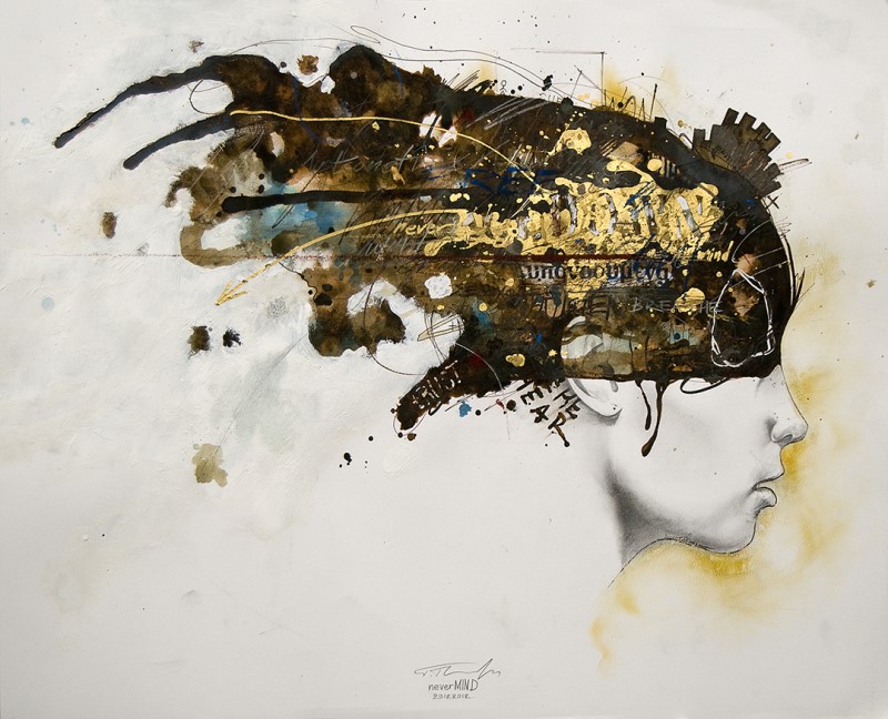Previous Image Next Image 05 ‘neverMIND’, Μολύβι, μελάνι, ακρυλικό, λαδοπαστέλ και χρυσός μαρκαδόρος σε χαρτί, 42εκ.Χ53εκ., 2012 ‘neverMIND’, Pencil, ink, acrylic, oil-pastel and golden marker on paper, 42cm.X53cm., 2012